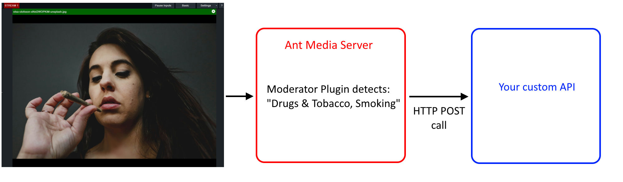 The moderator plugin keeps an eye on the stream content and if any inappropriate content is detected, a preconfigured action is executed, e.g. sending an API call to the preconfigured webhook, stop ongoing broadcast immediately, capture and save/send problematic screenshot.