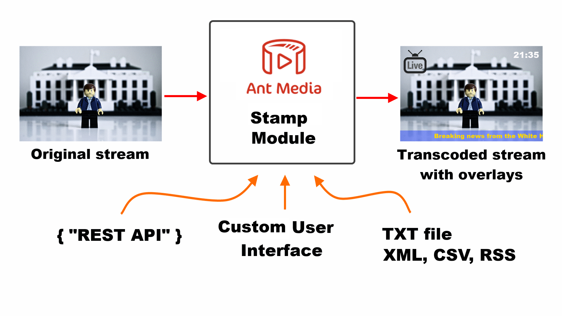 It can be used to decorate your live video stream with scores, stock prices, clock, captions driven by REST API calls.
